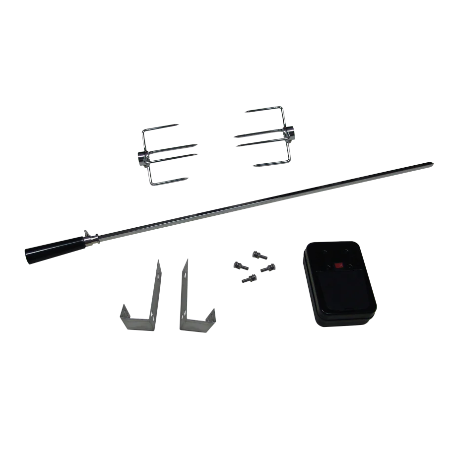 See on terviklik pöördgrilli komplekt sinu gaasigrillile. See sisaldab kõike vajalikku: pöörlevat varrast, kahte tugevat vardaotsikut ja kahte aasa, et saaksid liha kindlalt fikseerida ja kohe grillima asuda.