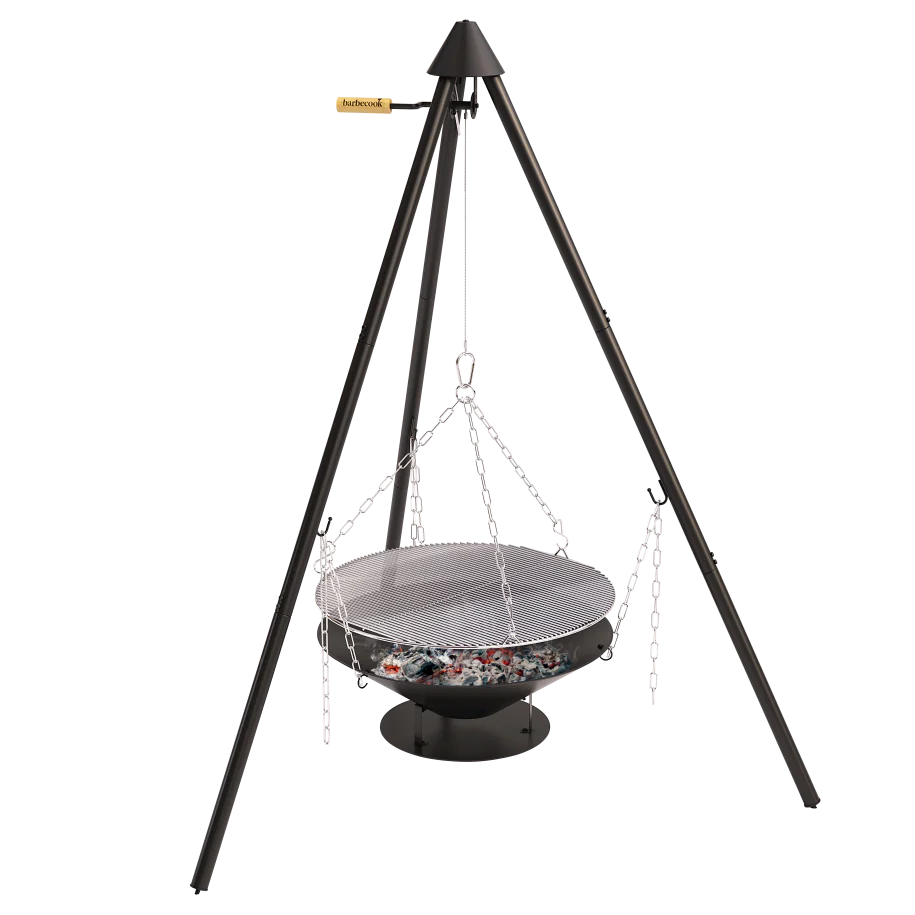 Kolmjalgne konstruktsioon koos tõmbesüsteemiga: Võimaldab reguleerida küpsetusresti või poti kõrgust tule suhtes, tagades optimaalse kuumuse ja küpsetustulemuse.